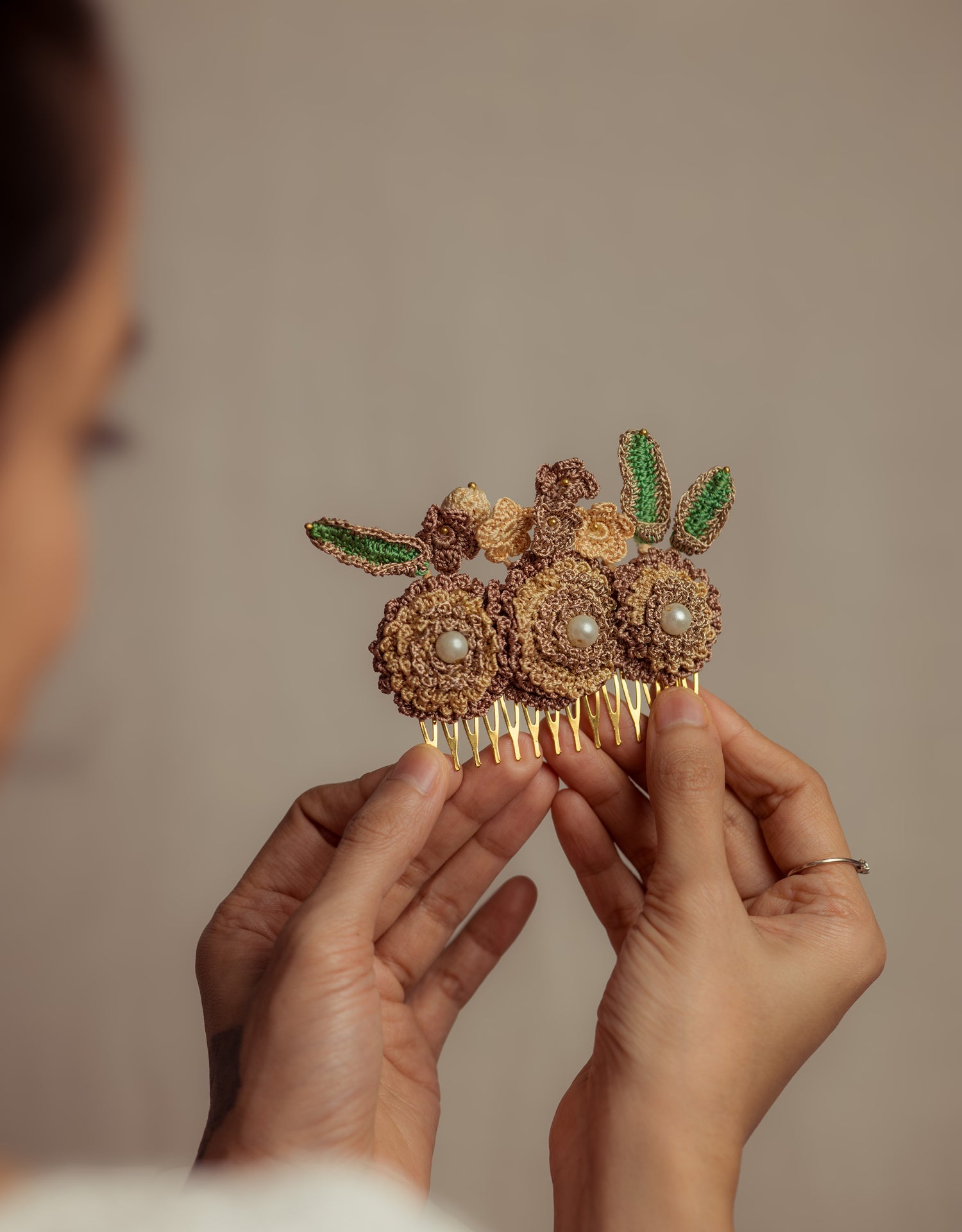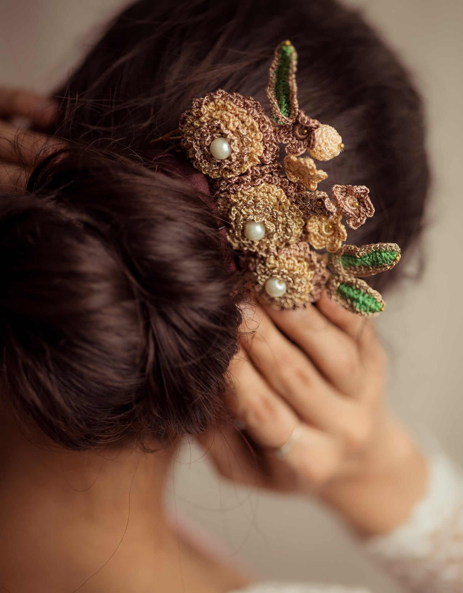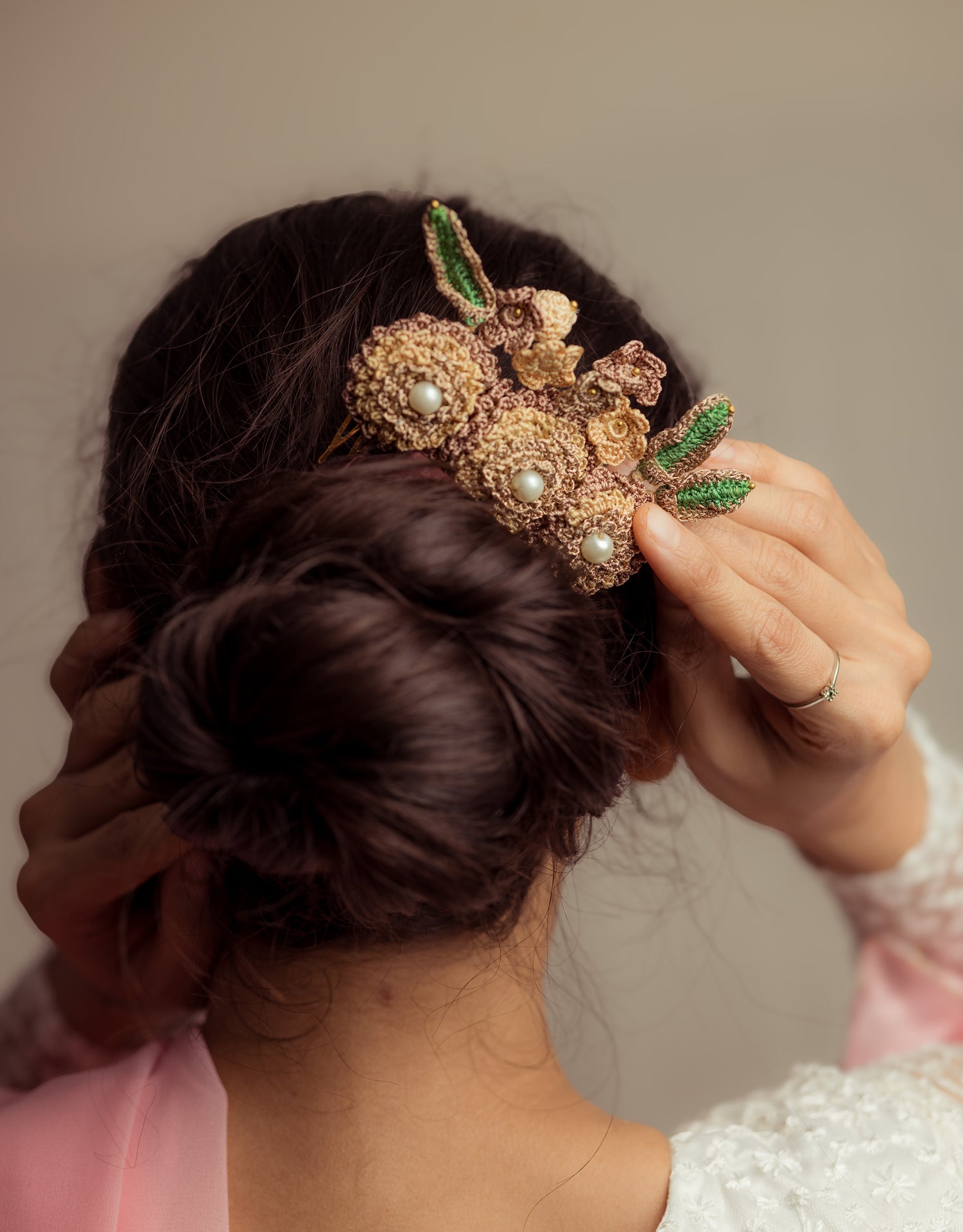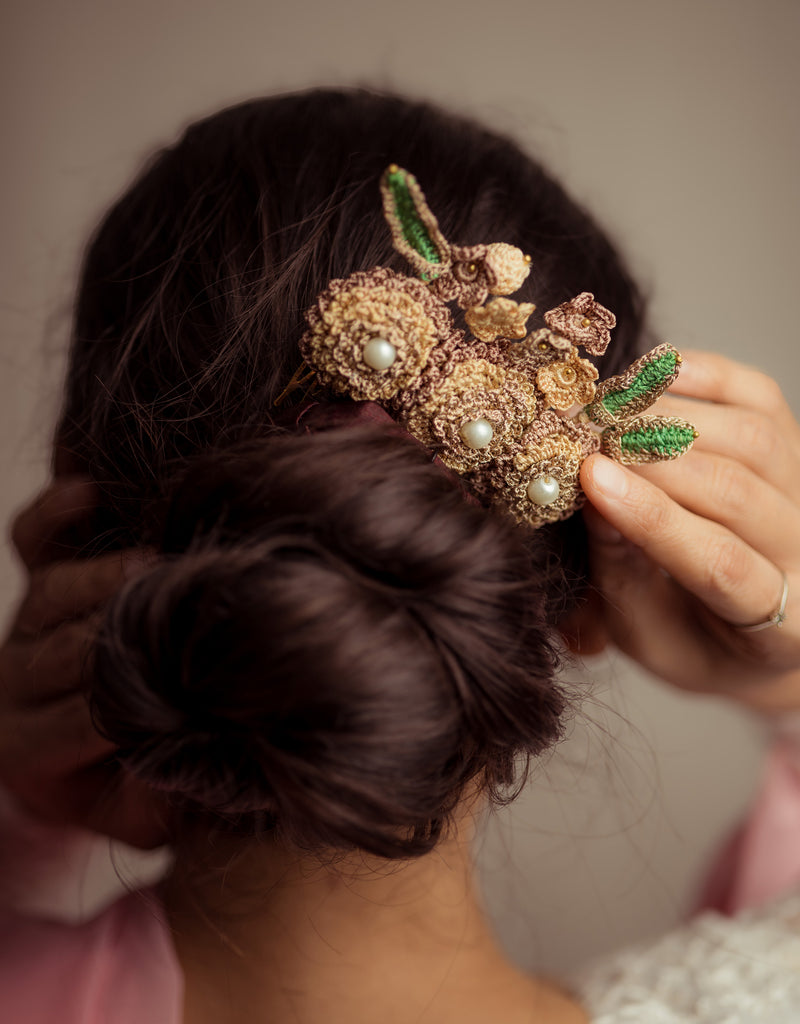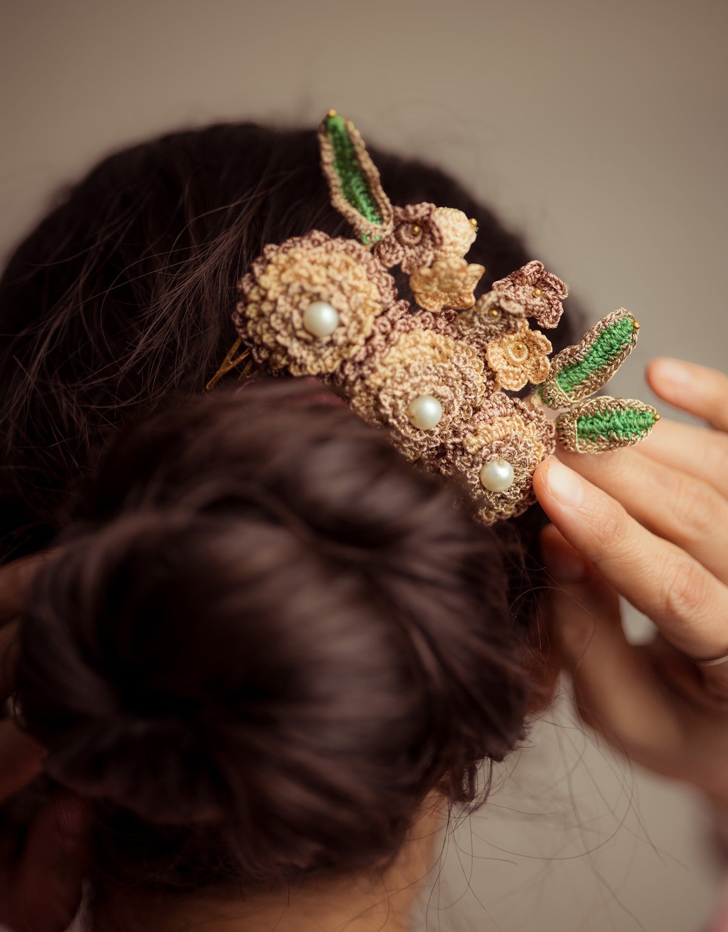Add a touch of vintage charm to your hair with guncha crocheted floral hair comb pins inspired by regal styles worn by queens across cultures. Crafted on a durable metal base and adorned with vibrant blooms, these pins are lightweight, easy to maintain, and perfect for both festive and party occasions. Let your accessories tell your story. Choose sustainable, handcrafted beauty that speaks of tradition with a modern twist.
