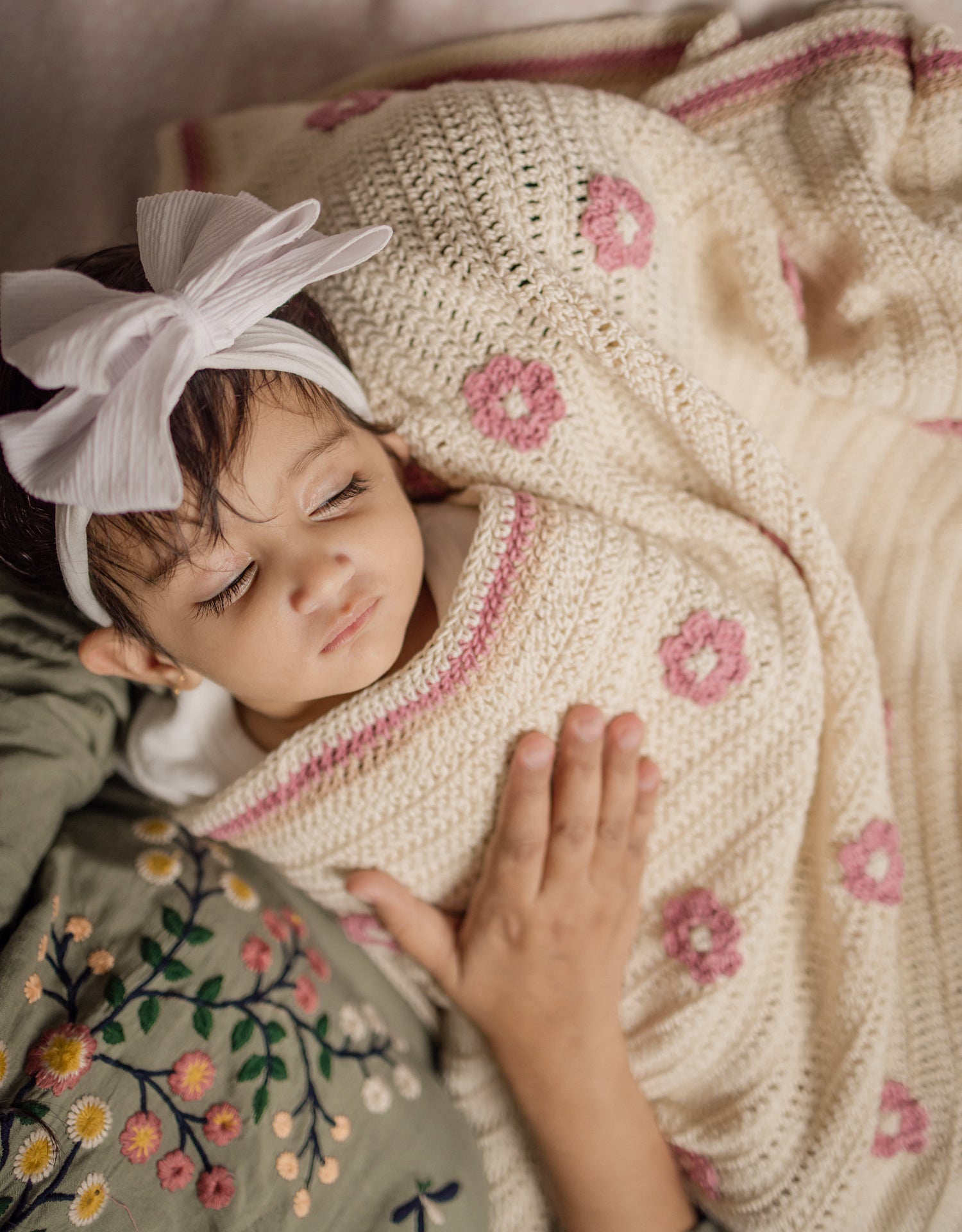 Handwoven crocheted baby blanket with a beautiful pink and white pattern. Soft & cozy for your little one to curl into.