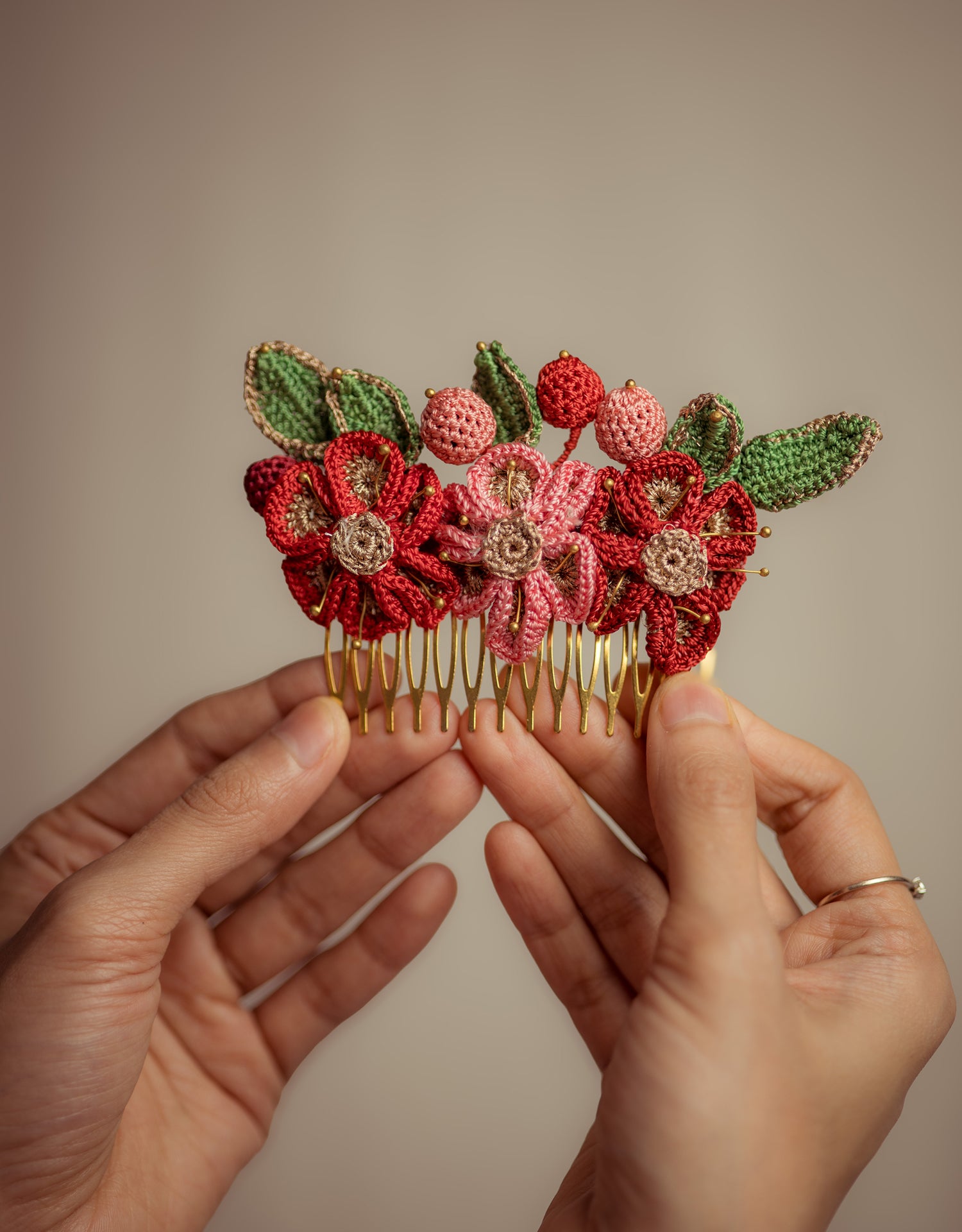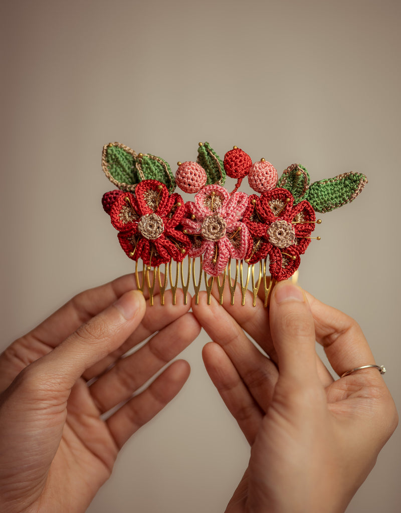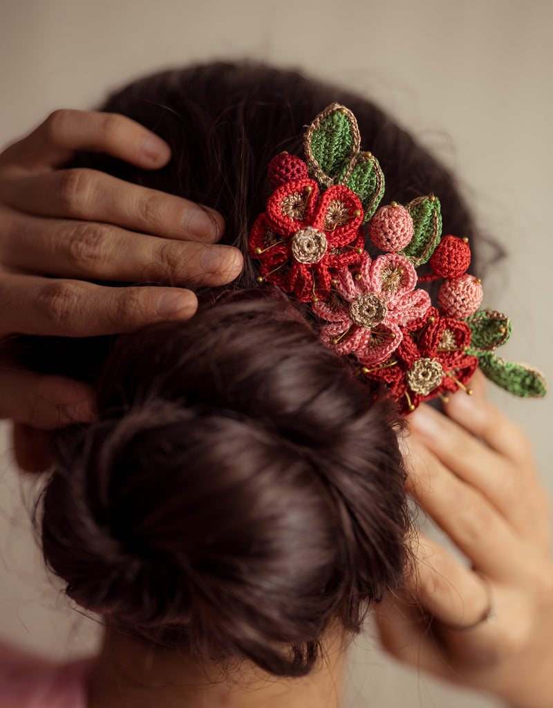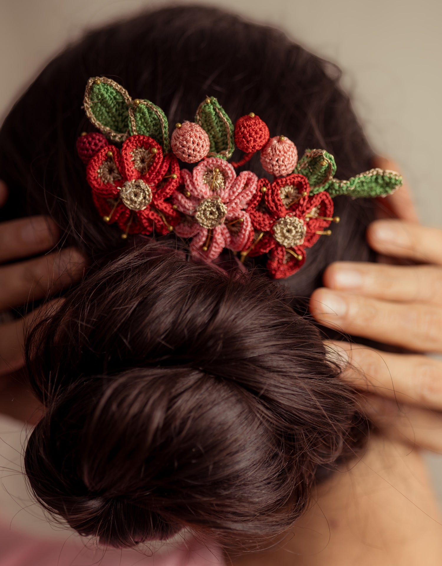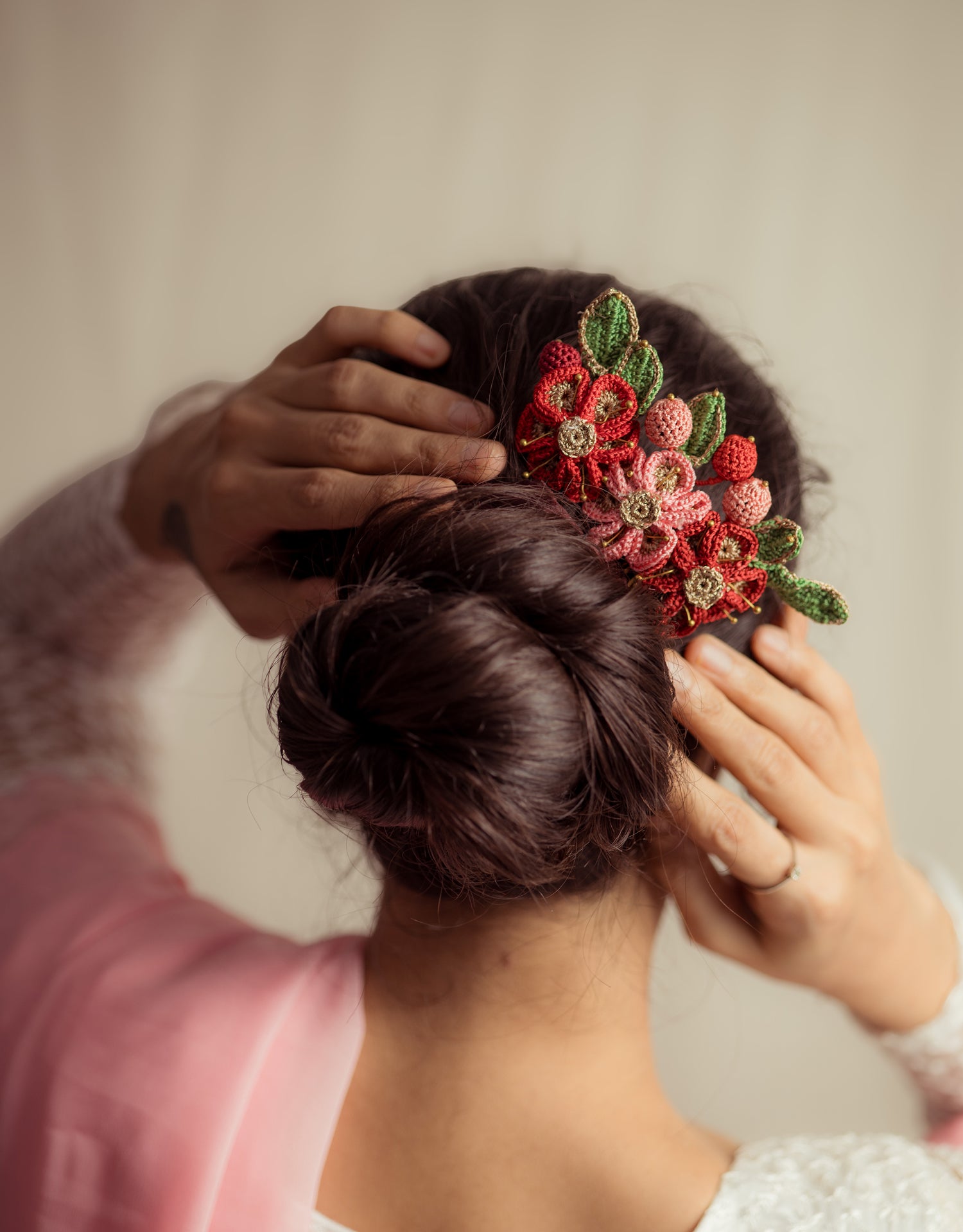 Add a touch of vintage charm to your hair with guncha crocheted floral hair comb pins inspired by regal styles worn by queens across cultures. Crafted on a durable metal base and adorned with vibrant blooms, these pins are lightweight, easy to maintain, and perfect for both festive and party occasions. Let your accessories tell your story. Choose sustainable, handcrafted beauty that speaks of tradition with a modern twist.